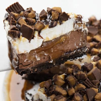 这个食谱是一层又一层的味道和质地。首先是厚厚的奥利奥饼干皮,上面覆盖着浓郁的浓稠软糖酱。然后将融化的巧克力片加入奶油奶酪和浓奶油中作为中间层。然后,加入一层甜美的焦糖酱。除此之外,还有覆盖着更多焦糖、软糖和里斯花生酱杯的鲜奶油。