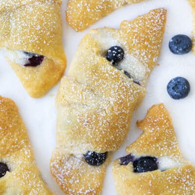 蓝莓奶油芝士月牙咬是一种用奶酪蛋糕和新鲜蓝莓填满、擀平、烘烤的月牙卷。如果这些听起来不错,一定要试试我的蓝莓奶油芝士棒.