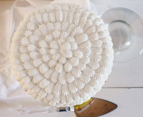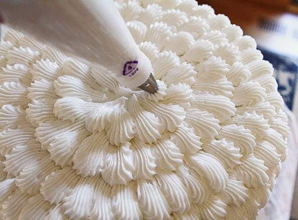 在这一点上,你可以确定你想要的每个dab的大小;试着让整个蛋糕保持一致。围绕蛋糕继续这个动作,直到完全覆盖蛋糕底部。
