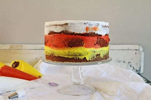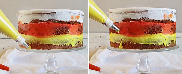 首先把你的黄色蛋糕放在蛋糕架上。加入大约1/2杯黄色奶油。小心地把橙子蛋糕放在上面。覆盖大约1/2杯橙奶油。把白色蛋糕放在上面。抹平多余的糖霜。
