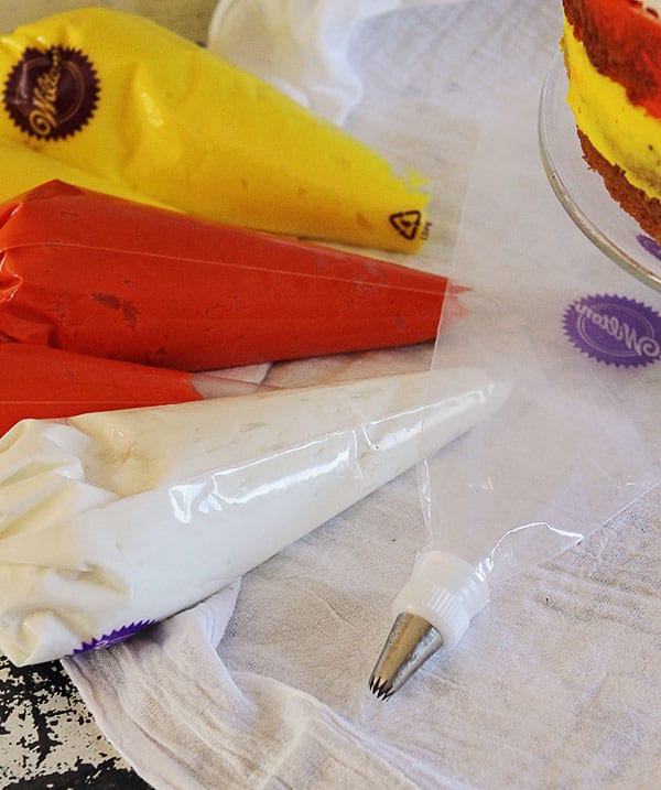 接下来是糖霜。有两个满的奶油乳酪食谱这里有很多糖霜。将一份蛋糕平均分成两份,然后将一份涂成黄色,一份涂成橙色,尽量与你煮好的蛋糕的颜色相配。留下剩余的奶油白色。用保鲜膜覆盖直到可以使用。