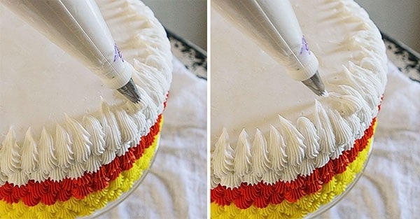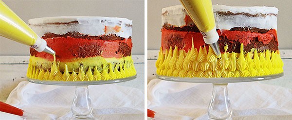 从32号尖的袋子里的黄色糖霜开始;把你的尖放在蛋糕的底部。施加压力,然后向上俯冲。如果你对这个动作感到不舒服,可以在一张羊皮纸上练习,直到感觉合适为止。