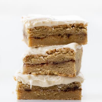 从我的blondies食谱,但我没有在面糊里加奶油糖果片。相反,我做了一个分层的金发蛋糕,底部是面糊,顶部中间是肉桂糖混合物。然后,我在巧克力棒上放了自制的奶油奶酪。就像条状的肉桂卷。更具体地说,这就像吃肉桂卷的中心,最好的部分,充满了肉桂!