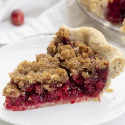 Cranberry Pie is a deliciously tart pie that starts with a homemade pie crust filled with sweetened cranberries and topped with a nutty streusel topping. If this sounds good to you, try myFrench Apple Cranberry Pie, too!
