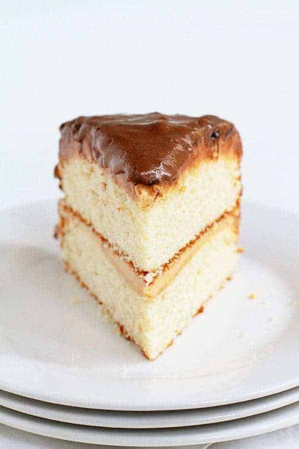 组装这个蛋糕我烤焦糖蛋糕。(配方的灵感来自一个发现MarthaStewart.com)