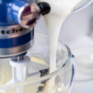 加入牛奶混合物冷却的碗站混合器。打松软的中间速度,直到结霜(2 - 3分钟),暂停刮下来的碗。
