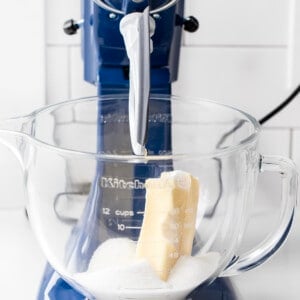 碗里装有桨附件的搅拌器,黄油和糖在中速搅拌至光和蓬松的(2 - 3分钟)。停止搅拌,用橡皮刮刀刮下的碗里。