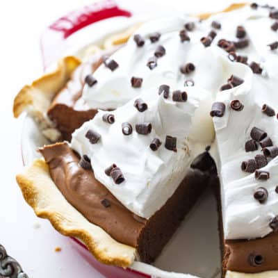 你做这个食谱的唯一烘焙是派皮,不管你是用商店买的饼皮还是自制的地壳.在你烤好饼皮之后,一定要让它冷却,然后再往里面填上好的材料——法国丝馅、打发的顶部和巧克力刨花!