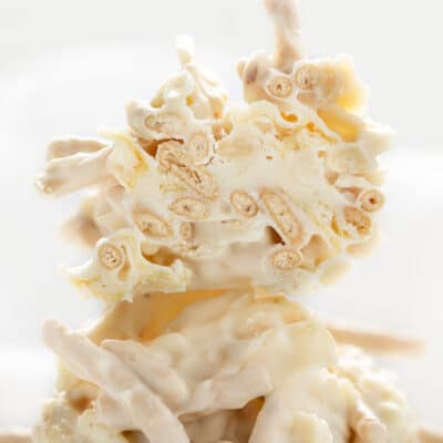 干草堆饼干是一种no-bake治疗这是用炒面、某种巧克力(在这种情况下是杏仁皮)和其他添加剂,如花生、椒盐卷饼,还有你会看到的薯片。它们有时被称为炒面饼干,很容易放在一起,而且在一年中的任何时候都可以分享。但是,当你的烤箱被用于许多其他食谱时,它们特别适合在节日里做。