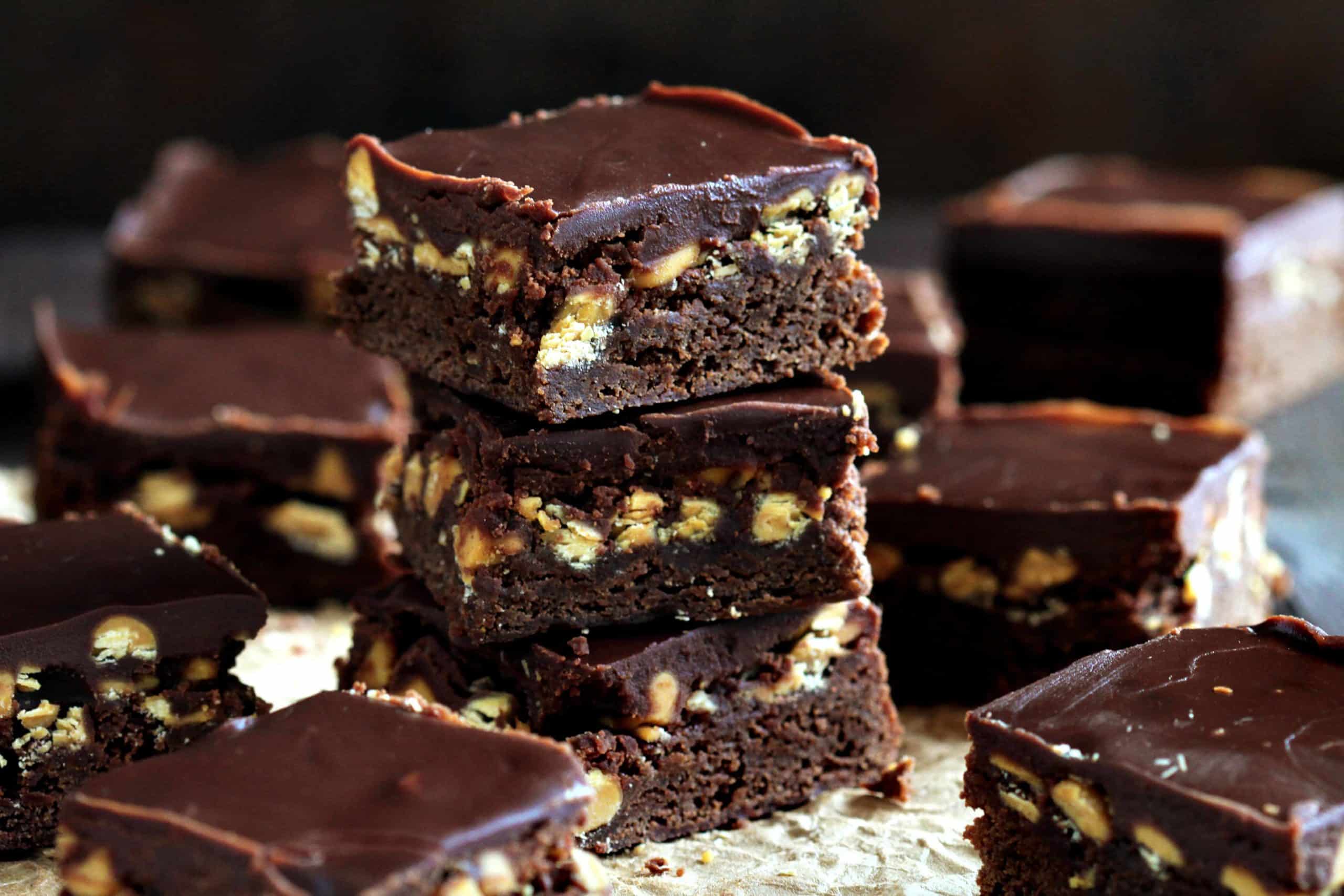 我知道我喜欢巧克力和花生酱,但在混合中加入奶油糖果会让这些布朗尼达到一个全新的水平,真的!首先是我的布朗尼蛋糕法式丝绸布朗尼配方。然后,烤好布朗尼,在上面撒上一些奶油糖果片。最后,把花生酱、奶油糖果甘纳许倒在上面,这是一种甜点!