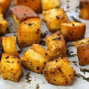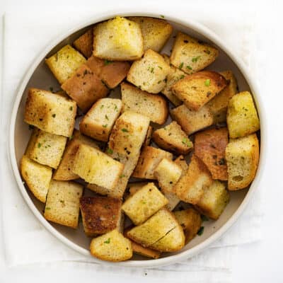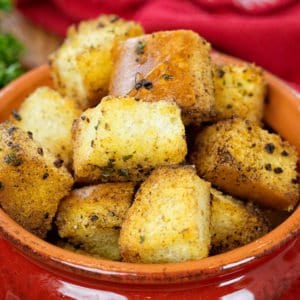 家庭自制面包丁富含味道,会融化在你的嘴,并且容易使你永远不会想要现成的油炸面包丁!他们是完美的零食,以及一流的了gydF4y2Ba楔形沙拉gydF4y2Ba!gydF4y2Ba