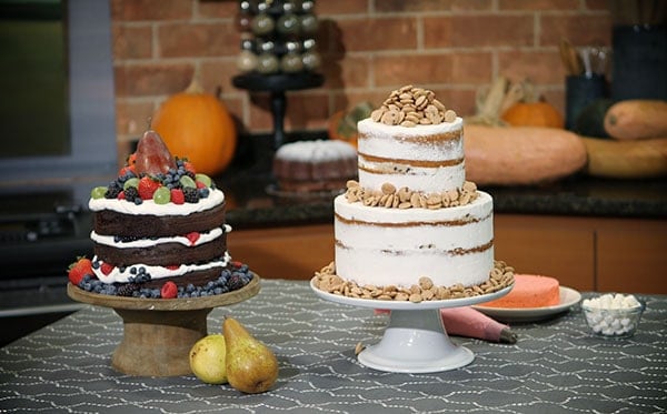 我也准备了一个巧克力赤裸裸的水果蛋糕。这是两个食谱巧克力蛋糕划分为四个8英寸圆蛋糕平底锅。为了旅行和电视,我选择只使用三个四层。它只是要太高有四个。