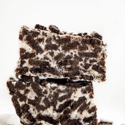 经过广泛的搜索和努力,这里是结果。配方是一个更柔软/更有嚼劲的产品落在非常甜的一面。使用普通的奥利奥会产生更干燥/更脆的巧克力棒,它的甜味更少,巧克力味更浓。使用普通的奥利奥,在融化的棉花糖中加入3大汤匙香草糖霜(我用的是自制的),会让奥利奥的质地和味道更接近原味,但会有更多巧克力味,更甜。最后,使用普通的奥利奥,但多放一杯棉花糖,就能做出更柔软、更有嚼劲、但不那么甜的巧克力棒。我对冷冻它们没有意见,但不建议冷冻食用。