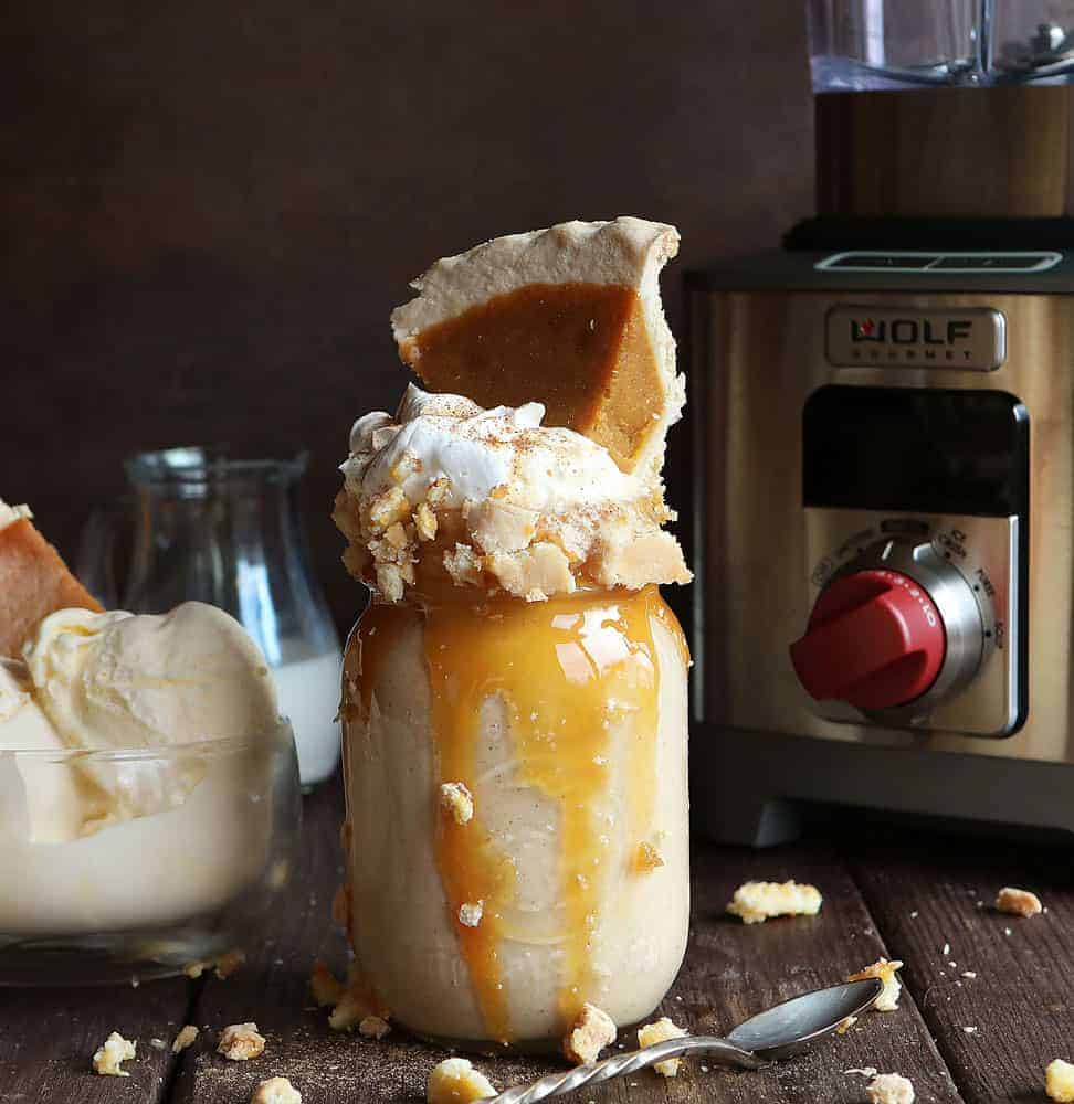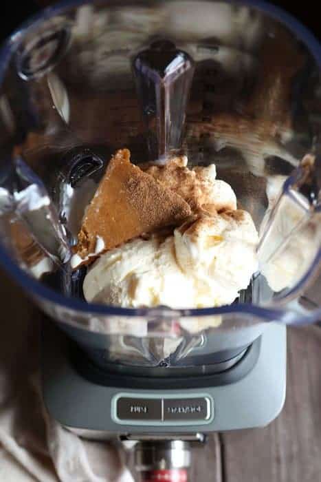 地方冰淇淋、牛奶、南瓜馅饼香料,和一个南瓜饼片(无地壳)在狼美食搅拌器。把旋钮奶昔,让搅拌机发挥它的魔力。