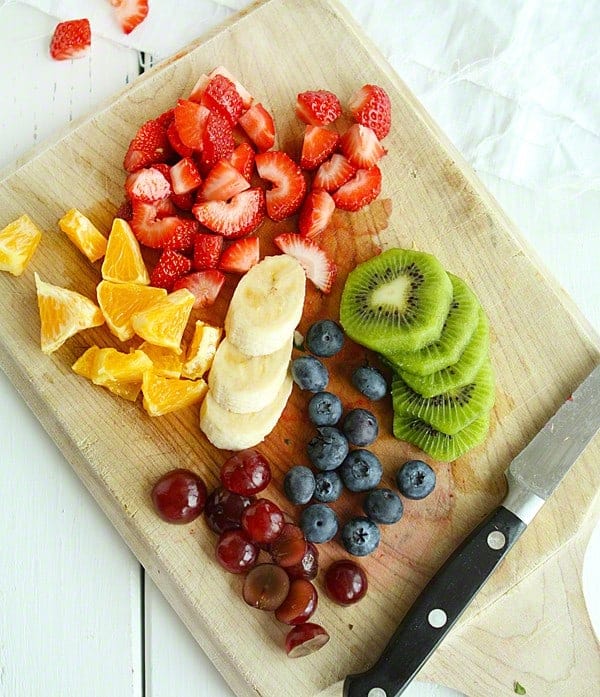 我没有给具体数量的切水果,因为它可以改变所以大大你如何削减它的大小以及水果切之前,更不用说考虑饼干的大小。一般来说,我使用约1杯的水果和蓝莓,丁2猕猴桃,香蕉。
