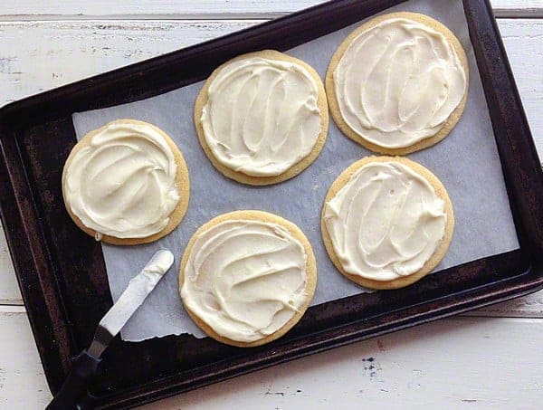 奶油干酪糖霜做准备。传播一些糖霜在六饼干。备用。