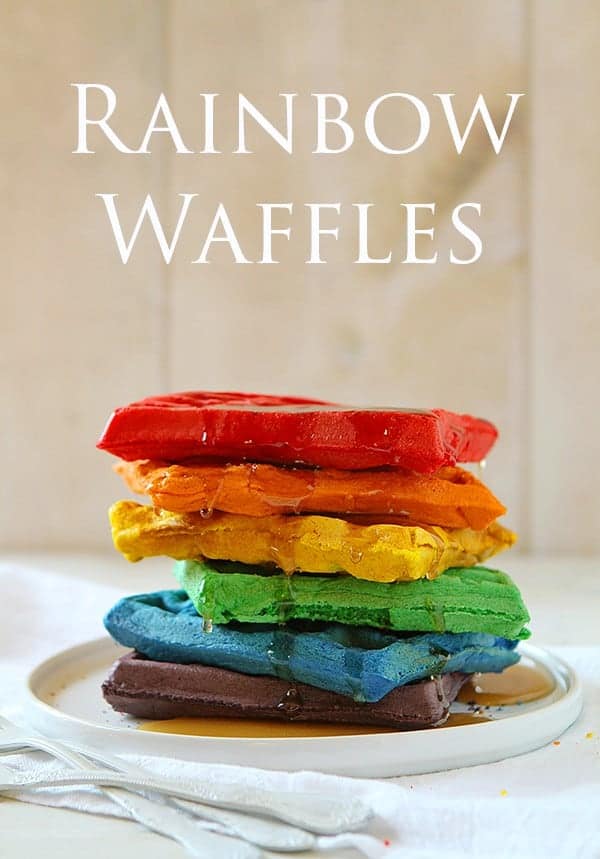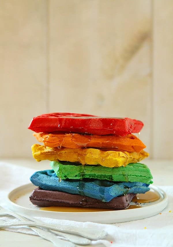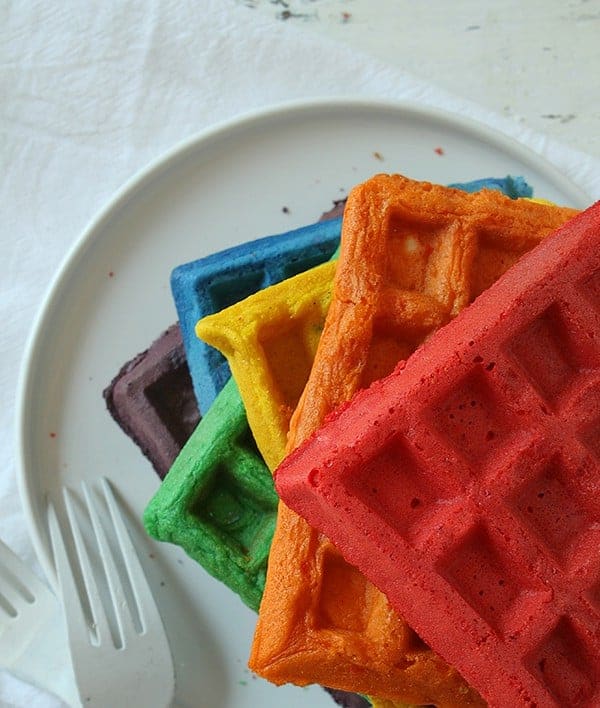 前一晚他的生日他改变了起来,要求华夫饼干,我乐意效劳。这些彩虹华夫饼是有趣的和美味。我丈夫和我笑了每次他们会说,“我最喜欢黄色的。”