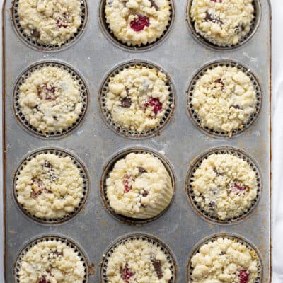 覆盆子巧克力松饼是奶油奶酪松饼,里面有巧克力块和新鲜的覆盆子,上面再撒上一层黄油面包屑。如果你想吃更多的巧克力,一定要尝尝我的终极巧克力纸杯蛋糕.