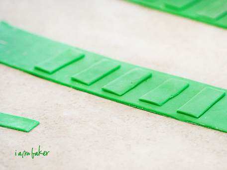 辊方旦糖1/8英寸1/4英寸厚度,然后切成条状。带大小会有所不同,这取决于你的蛋糕的高度和宽度。