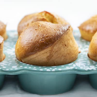 与弹饼最接近的食物是约克郡布丁,它根本不是我们所知道的布丁。它的配料类似于美国弹饼的配料,但在食谱中增加了肉的锅滴。在这些酸面包泡饼里,我加了酸酵给他们一点酸面包的味道。别担心,它们不会有太多酸面团的味道,唯一的问题是它们的顶部会溢出来。