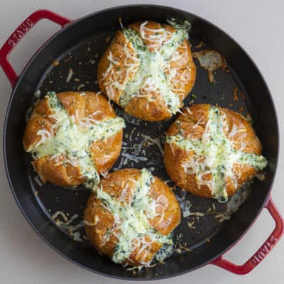 把你的开胃菜带到下一个层次,这菠菜洋蓟蘸拉分开面包。没有人会对这种美味、奶油、奶酪的面包敬而远之。填充卷是指个人份量,但足够两个人分享!想要丰富又颓废的蘸酱,试试我的芝士煎锅菠菜洋蓟蘸酱.