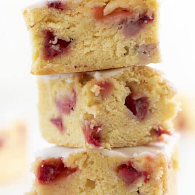 这些草莓柠檬的釉Blondies是可选的,但是有两种不同的口味选择。我做的釉是由细砂糖和柠檬汁。这是对blondies柠檬味道的完美补充。然而,你也可以使釉水的柠檬汁。