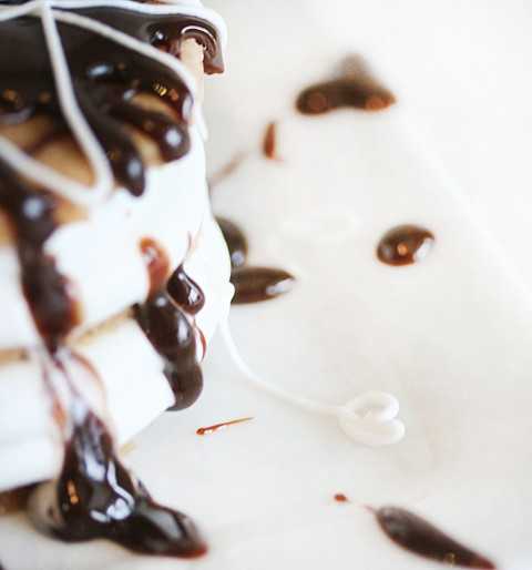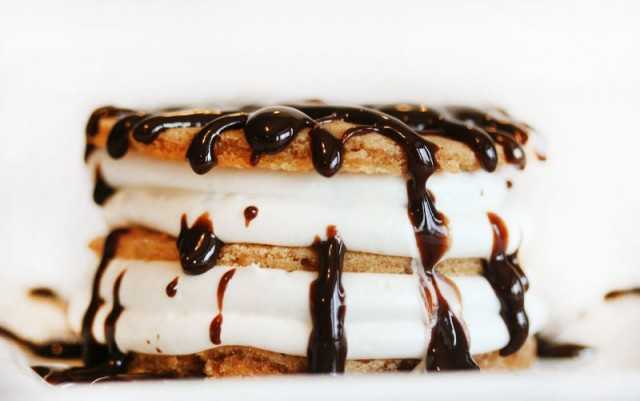 拿一块圆形饼干,把它放在你的盘子或托盘上。用滚边袋轻轻加入糖霜(如果你聪明的话,也可以加入生奶油)。再加一块饼干,再做一层糖霜。轻轻加入最后一块饼干。