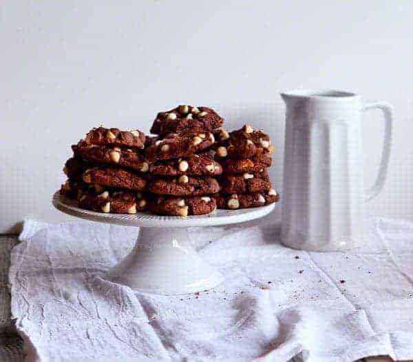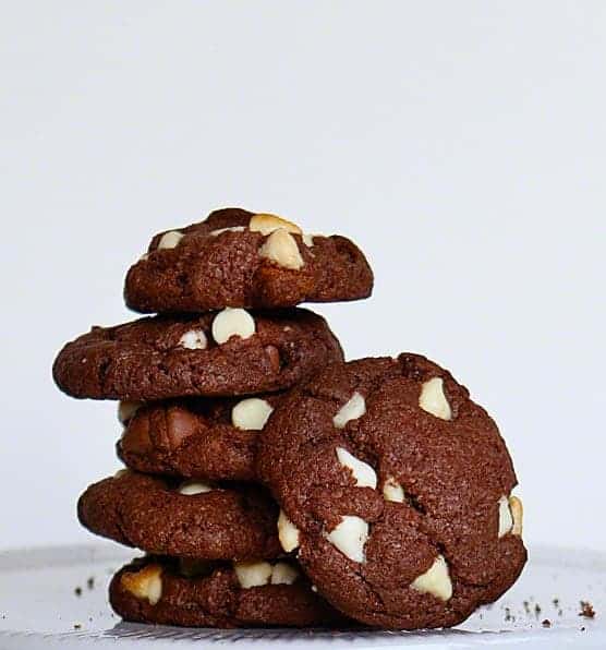 三鬼食品巧克力曲奇饼干用魔鬼蛋糕混合和白巧克力和牛奶巧克力。试试我的巧克力巧克力饼干另一个巧克力色饼干你会喜欢!