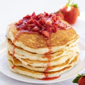 草莓芝士煎饼是一种蓬松的酪乳煎饼,里面有奶油芝士漩涡,上面浇上草莓糖浆。