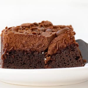 巧克力慕斯布朗尼是自制的巧克力蛋糕,上面有奶油巧克力慕斯和巧克力卷。