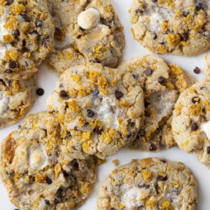 轻轻折叠在冷却玉米片危机,巧克力,迷你棉花糖。(面团会干,但它应该保持其形状在烤板上。)