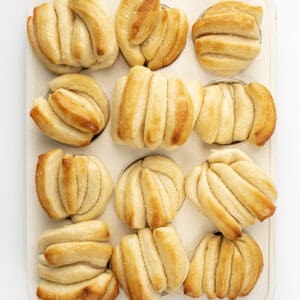 分组并堆叠成2个单独的部分(每个堆栈6条)。将每一叠面团切成6份,共12叠。每一叠都是一个卷。