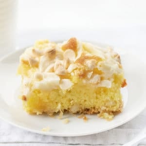柠檬地震蛋糕甜点,从一层开始椰子和澳洲坚果,紧随其后的是一个柠檬蛋糕和奶油奶酪漩涡,所有超过和烤白巧克力薯片。