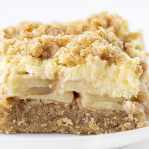苹果奶油芝士酒吧甜点酒吧充满了甜苹果和奶油芝士层,顶部和烘烤燕麦崩溃和下毛毛雨用焦糖酱。